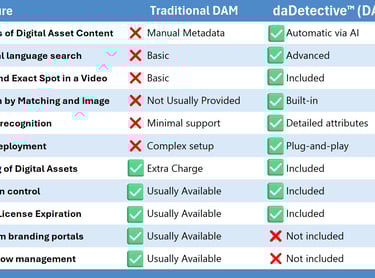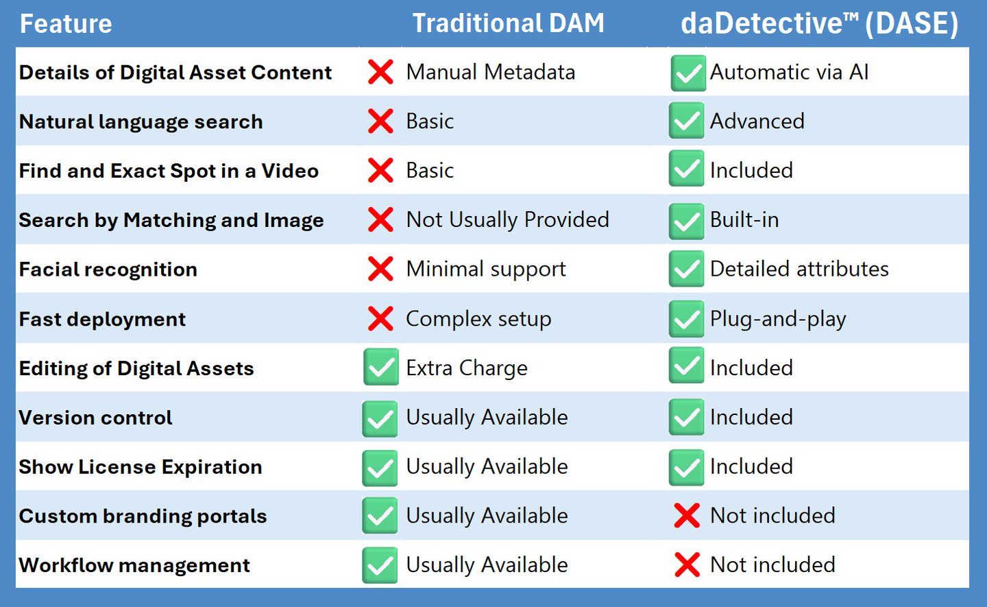DADetective is a Digital Asset Search Engine (DASE) — Built for instant, intelligent access to your media library without the overhead and complexity of a traditional Digital Asset Management system (DAM). For those that need the additional functionality of a DAM, we can integrate with yours!