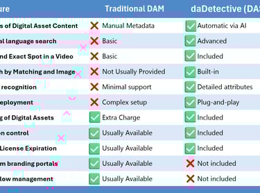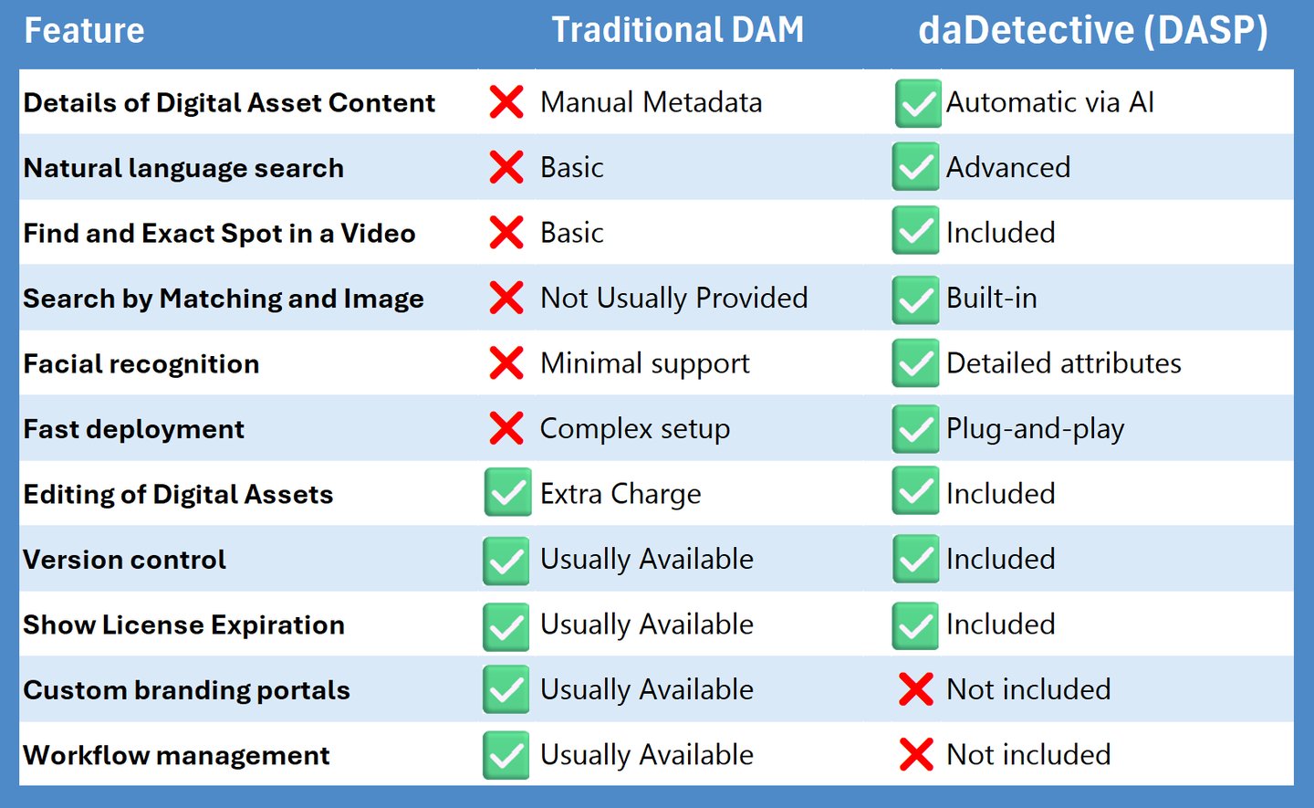 Digital Asset Management (DAM) systems focus on workflow management. They rely on manual metadata to keep assets structured and compliant. A Digital Asset Search Platform (DASP) which is built on a DASE, Digital Asset Search Engine, is designed for Quick and Easy Discovery using Natural Language.